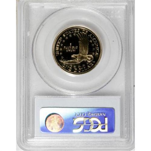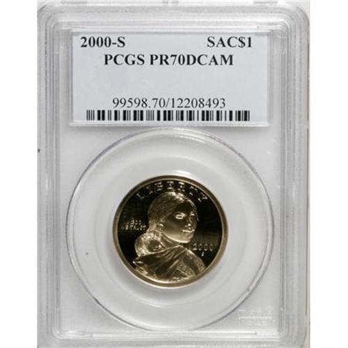 <B>2000-S $1 Sacagawea PR70 Deep Cameo PCGS.</B></I> The exquisite detail of this golden beauty depicts the design exactly as Glenna Goodacre intended. The fields and devices exhibit great contrast. 2008 is likely to be the final year of the type, since the Thomas D. Rogers, Sr. flying eagle will be replaced by a series of commemorative reverses. Population: 85 in 70 Deep Cameo, 0 finer (3/08).<BR><BR><b>Shipping:</b> Coins & Currency (<a target="_blank" href="http://www.heritageauctions.com/common/shipping.php">view shipping information</a>)