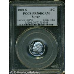 2000-S 10C Silver PR70 Deep Cameo PCGS. Stone-whit <B>2000-S 10C Silver PR70 Deep Cameo PCGS.</B></I> Stone-white, fully struck, and pristine. The Deep Cameo contrast is unimprovable. A magnificent modern U.S. Mint delicacy. Population: 38 in 70 (11/04). <BR><BR><B>Important notice:</B> Heritage usually auctions material at the rate of 200-250 lots per hour. On some occasions eBay Live bid software or the Internet may not be able to keep up with the pace of the auction. We recommend placing a realistic absentee bid now as insurance to avoid disappointment. Occasionally the auctioneer may eliminate or reject an eBay Live bid, and the auctioneer may also reopen a lot after the close of the eBay live bidding (usually because we missed an audience bid), and may reject your bid even if it shows you as the winning bidder. By bidding via eBay Live, you agree that Heritage may award the lot to another bidder at its sole discretion under the circumstances described above or any other reasonable circumstances. Since eBay bids are not shown to us until we open the lot on the floor, we treat those bids just like floor bids. In most cases the floor responds before the eBay bid is presented to us, due to Internet lag time, so for consistency we have made it a policy that floor bids are always considered first over tie eBay live bids. Also please note that all Heritage lots purchased through eBay Live carry a 20% Buyer's Premium. Please make sure you read the Terms and Conditions before you bid. This lot is being auctioned in conjunction with a live floor auction by Heritage Galleries & Auctioneers. All final auction and invoice information will be supplied by Heritage Galleries & Auctioneers, and all other information should be considered preliminary. Lot:5863
