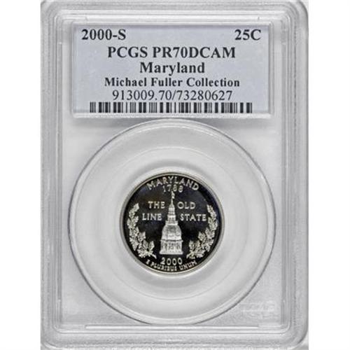 <B>2000-S 25C Maryland Clad PR70 Deep Cameo PCGS.</B></I> Michael Fuller Collection. PCGS Population (60/0). NGC Census: (0/0). Numismedia Wsl. Price for NGC/PCGS coin in PR70: $120. (#913009)<BR><BR><b>Shipping:</b> Coins & Currency (<a target="_blank" href="http://www.heritageauctions.com/common/shipping.php">view shipping information</a>)