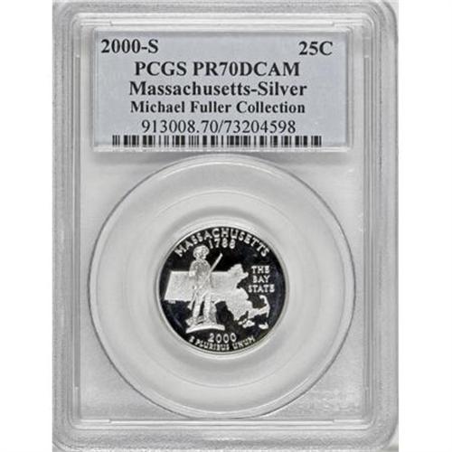 <B>2000-S 25C Massachusetts Silver PR70 Deep Cameo PCGS.</B></I> Michael Fuller Collection. PCGS Population (62/0). NGC Census: (1043/0). Numismedia Wsl. Price for NGC/PCGS coin in PR70: $120. (#913008)<BR><BR><b>Shipping:</b> Coins & Currency (<a target="_blank" href="http://www.heritageauctions.com/common/shipping.php">view shipping information</a>)