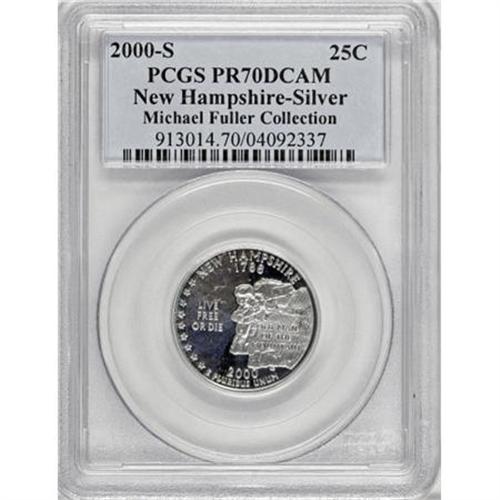 <B>2000-S 25C New Hampshire Silver PR70 Deep Cameo PCGS.</B></I> Michael Fuller Collection. PCGS Population (49/0). NGC Census: (881/0). Numismedia Wsl. Price for NGC/PCGS coin in PR70: $120. (#913014)<BR><BR><b>Shipping:</b> Coins & Currency (<a target="_blank" href="http://www.heritageauctions.com/common/shipping.php">view shipping information</a>)