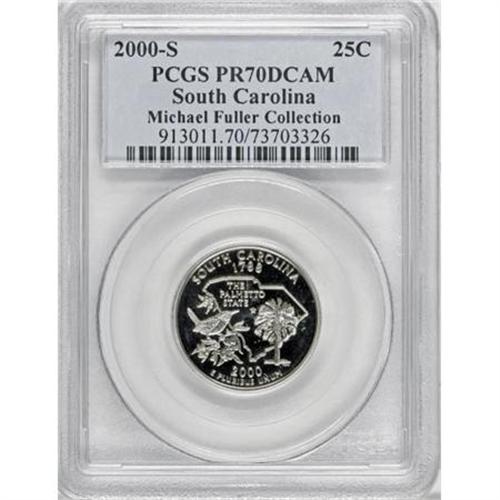 <B>2000-S 25C South Carolina Clad PR70 Deep Cameo PCGS.</B></I> Michael Fuller Collection. PCGS Population (66/0). NGC Census: (0/0). Numismedia Wsl. Price for NGC/PCGS coin in PR70: $120. (#913011)<BR><BR><b>Shipping:</b> Coins & Currency (<a target="_blank" href="http://www.heritageauctions.com/common/shipping.php">view shipping information</a>)