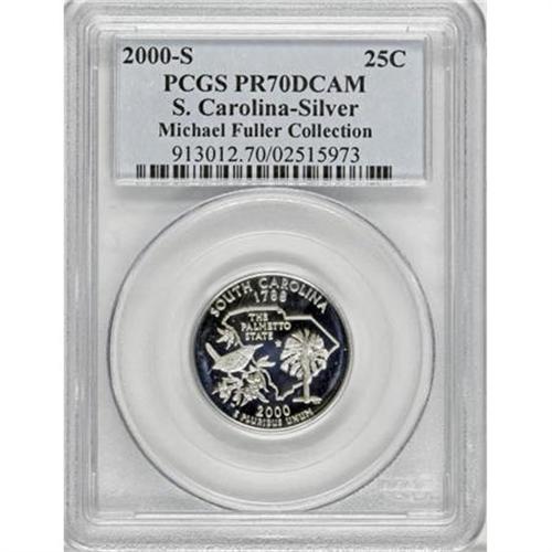 <B>2000-S 25C South Carolina Silver PR70 Deep Cameo PCGS.</B></I> Michael Fuller Collection. PCGS Population (49/0). NGC Census: (1000/0). Numismedia Wsl. Price for NGC/PCGS coin in PR70: $220. (#913012)<BR><BR><b>Shipping:</b> Coins & Currency (<a target="_blank" href="http://www.heritageauctions.com/common/shipping.php">view shipping information</a>)