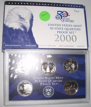 2000-S 50 STATE QUARTERS PROOF SET ISSUE PRICE WAS $13.95 HAS *MA/MD/SC/NH/VA* QUARTERS IN SET. SET COMES IN ORIGINAL MINT PACKAGE!! QUARTER PROOF SET CAME OUT OF SAFE!! ***Coin, Currency & All Items Listed in this auction - Grades, Conditions and Values are not Safe Deposit Coins LLC Responsibilty. Grades, Condition and Values are determined by Consigner(s) & Buyers