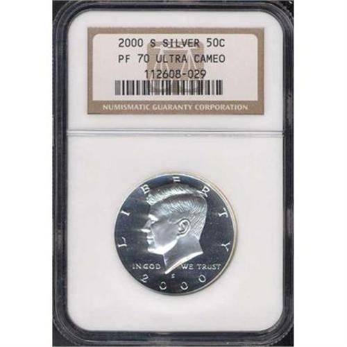 <b>2000-S Kennedy Half Dollar. Silver. NGC graded PF70 UC.</b> A rare perfect quality silver Kennedy half dollar for the date, this example displays almost enthralling luster on the "ultra" cameo devices whose satin surface is untoned, with sharp detail throughout. The mirrors are infinitely deep here <b>(PCGS # 96913)</b>