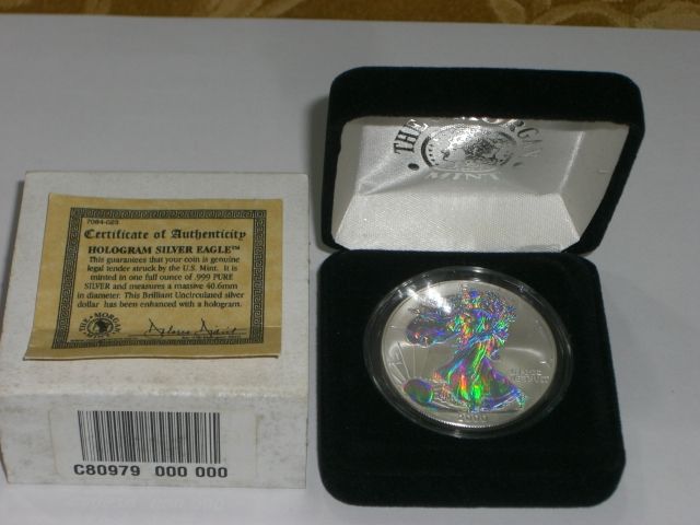 2000 SILVER EAGLE LIMITED MINTED *HOLOGRAM* SILVER EAGLE COMES IN ORIGINAL BOX/PACKAGE WITH CERTIFICATE OF AUTHENTICITY!! SILVER EAGLE CAME OUT OF SAFE BOX!! ***Coin, Currency & All Items Listed in this auction - Grades, Conditions and Values are not Safe Deposit Coins LLC Responsibilty. Grades, Condition and Values are determined by Consigner(s) & Buyers ONLY