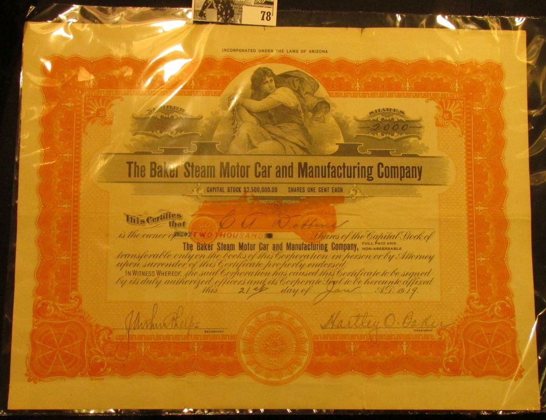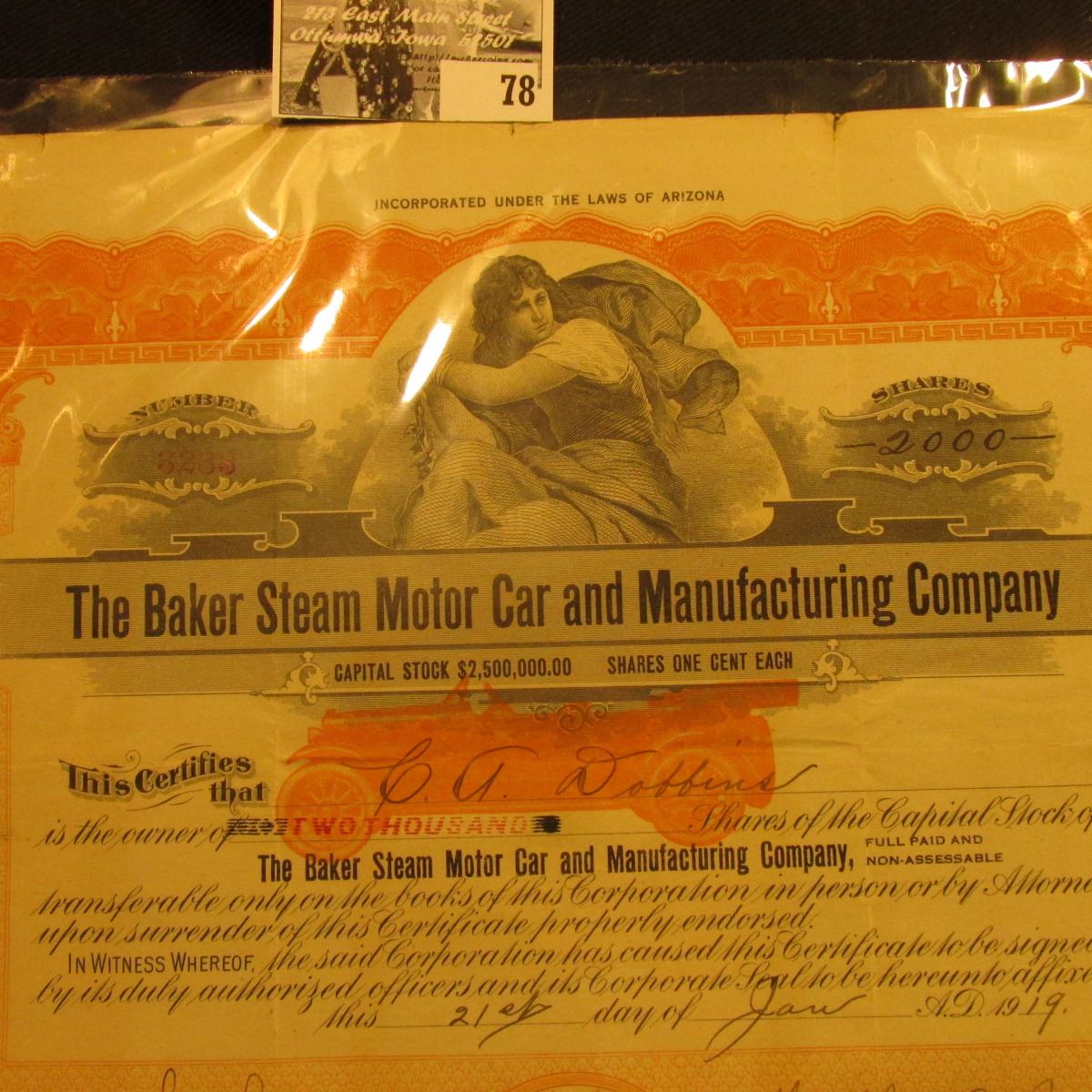 2000 Shares "The Baker Steam Motor Car and Manufacturing Company" Stock Certificate with Motor car imprint beneath panel. 'Doc' stated this variety was issued between 1918-23 and was valued at $275.00. Dated January 21st, 1919.