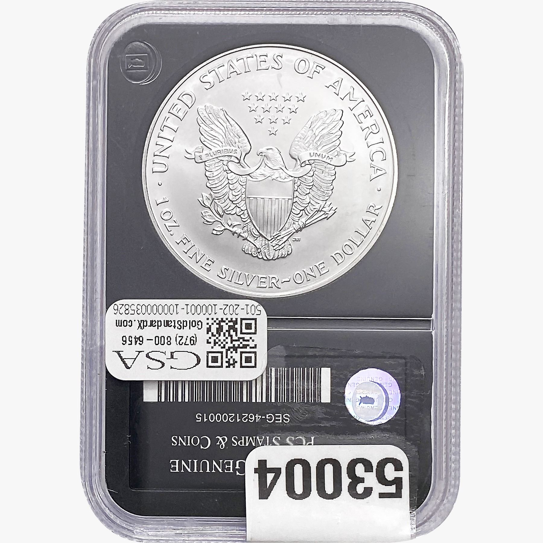 e. Coins sold referencing a third-party grading service are sold “AS IS” without any express or implied warranty, except for a guarantee by GSA that they are genuine. Removal or alteration of the holder, voids all of Bidder’s claims concerning that Product. Certain warranties may be available from the grading services and Bidders are referred to them for further details: Numismatic Guaranty Corporation (NGC), PO Box 4776, Sarasota, FL 34230, www.ngccoin.com/services/writtenguarantee.asp; Professional Coin Grading Services (PCGS), PO Box 9458, Newport Beach, CA 92658, www.pcgs.com/guarantee.html; ANACS, 6555 S. Kenton St., Ste. 303, Englewood, CO 80111; and Independent Coin Grading Co. (ICG), 7901 East Bellview, Ave., Suite 50, Englewood, CO 80111.