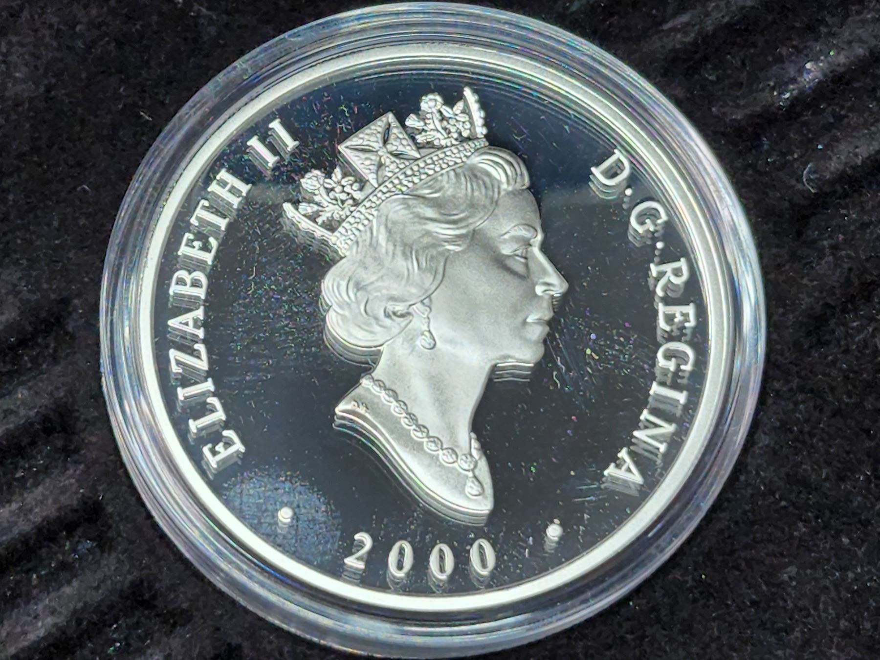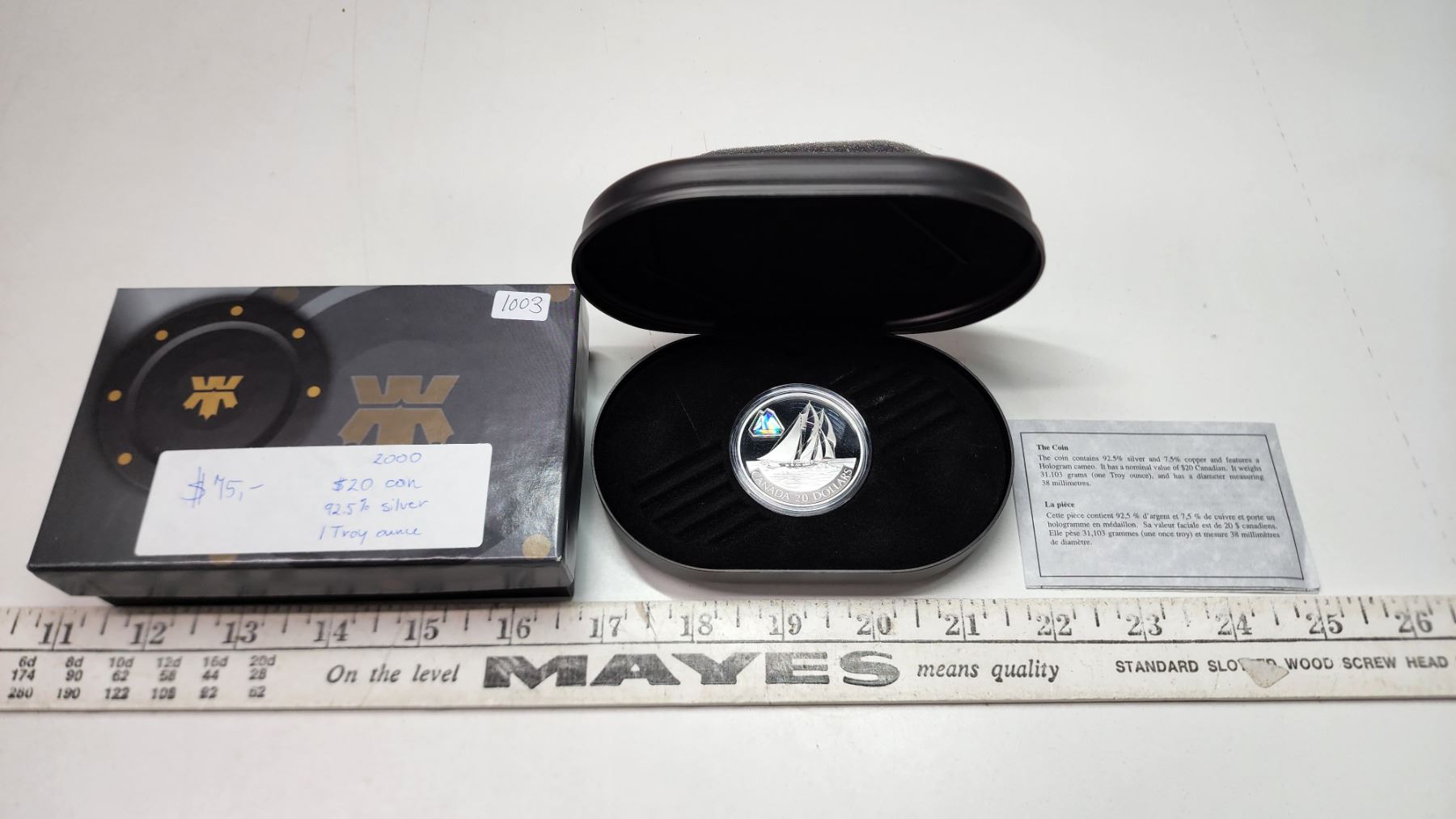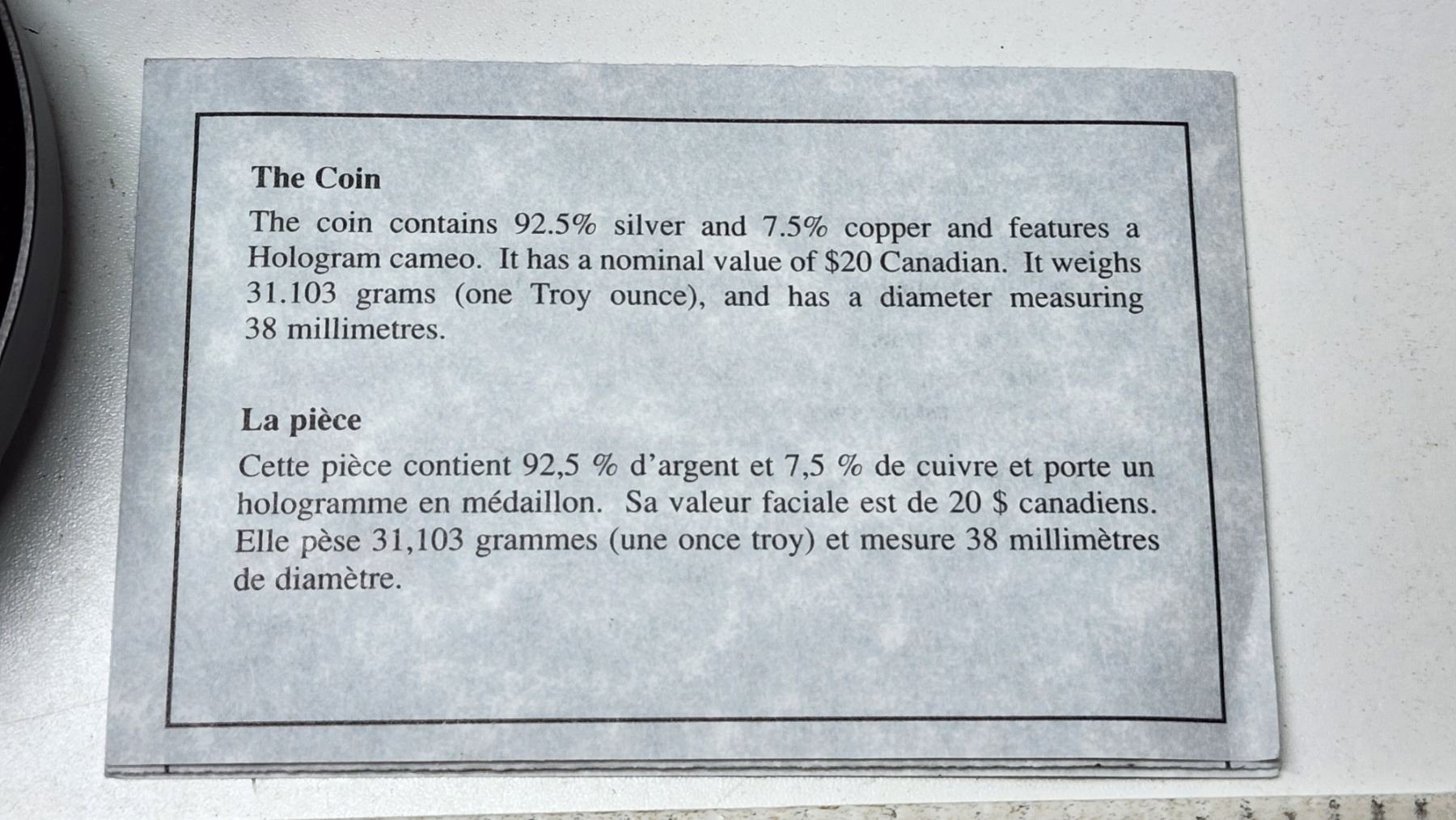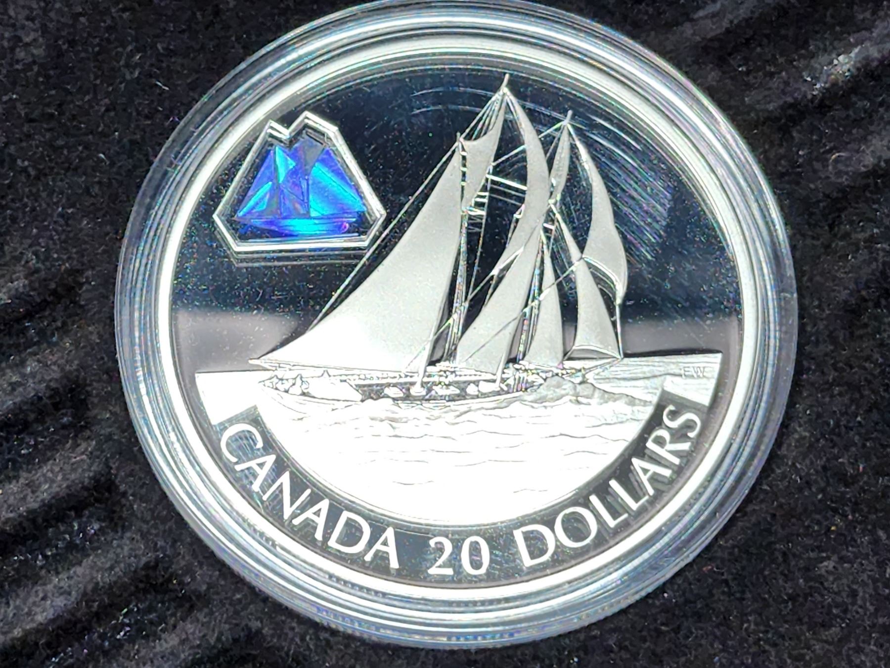 2000 The Bluenose Hologram $20. Sterling Silver. Proof with Ultra Heavy Cameo. Most famous Canadian schooner. Housed in its original case & box of issue.