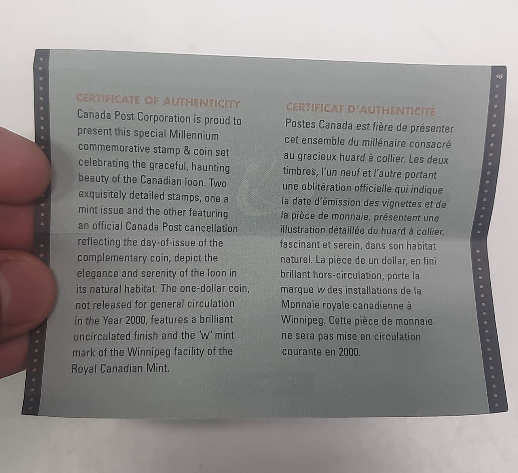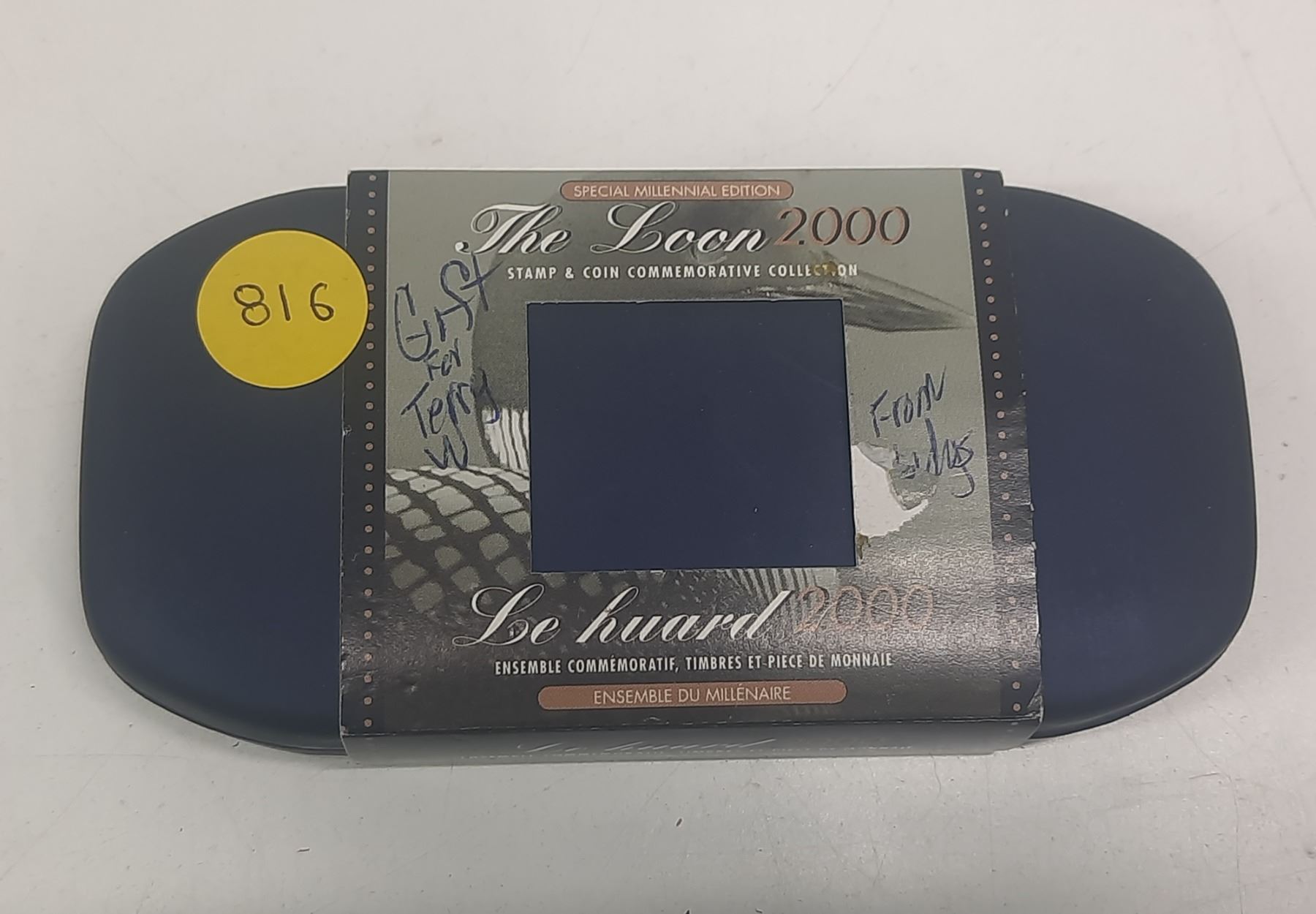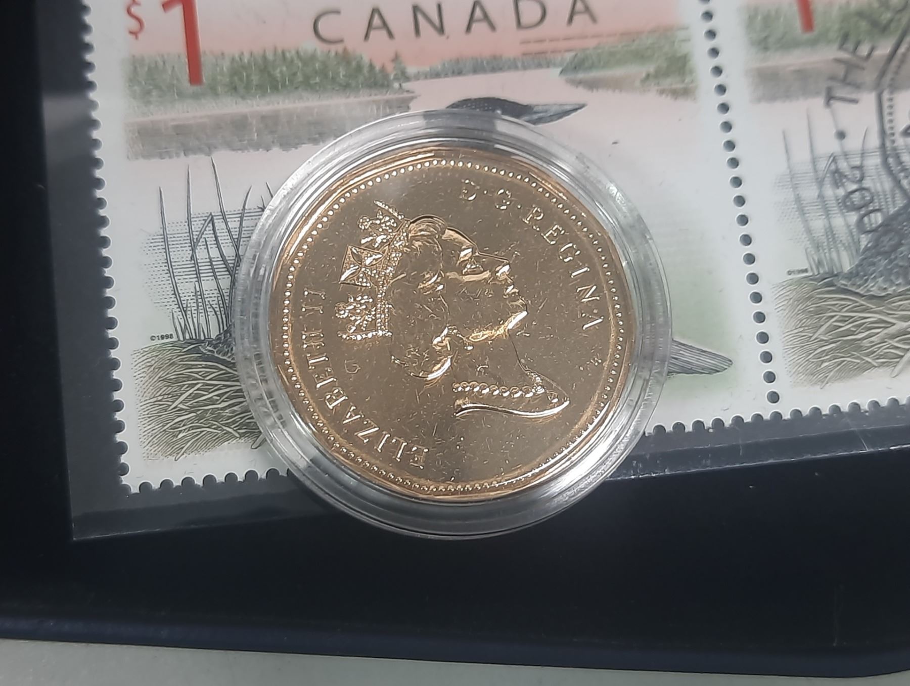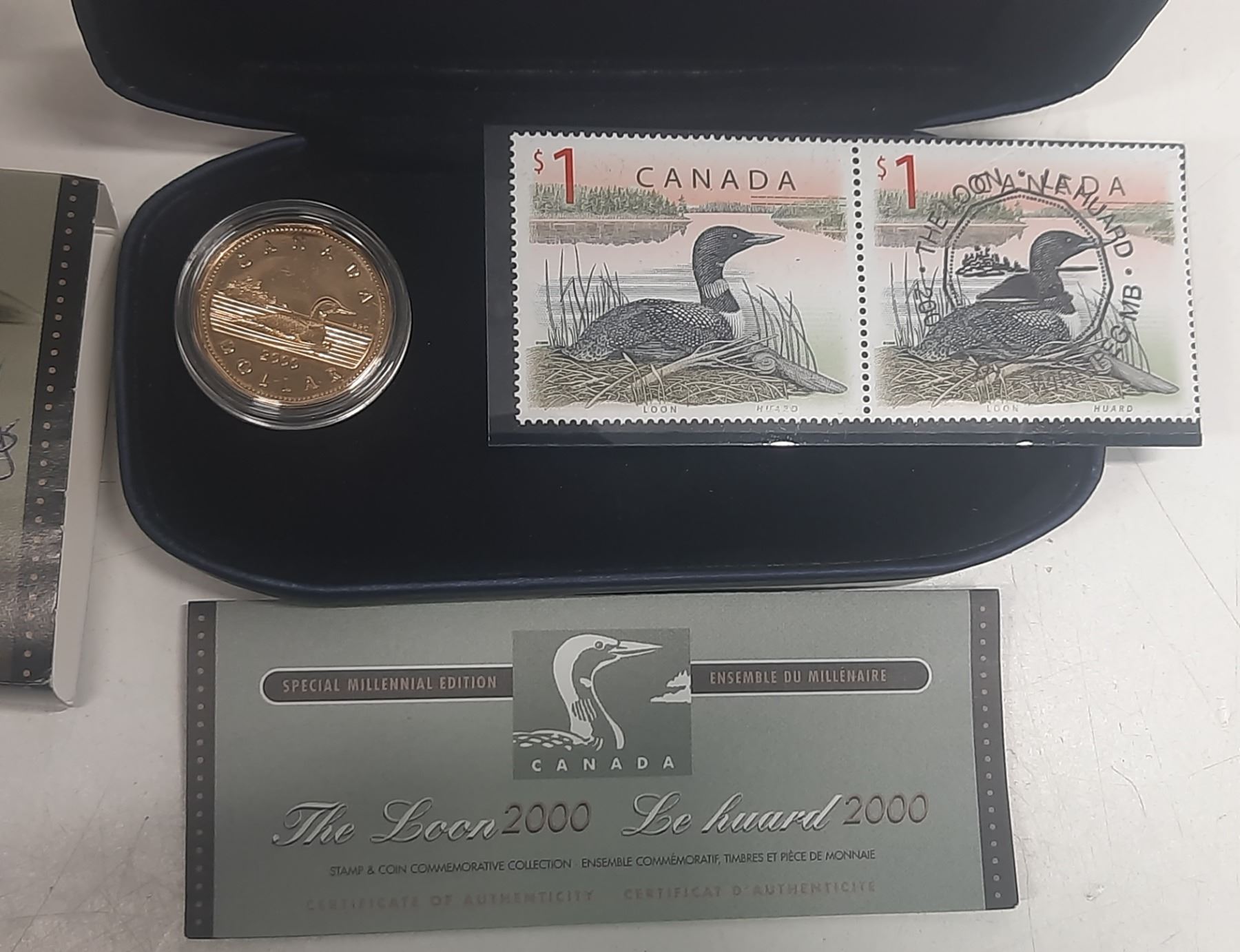 2000 The Loon Stamp & Coin Special Millennium Commemorative Collection. Includes special loonie with W on the obverse plus 2 $1 Stamps. Housed in its original Canada Post packaging.