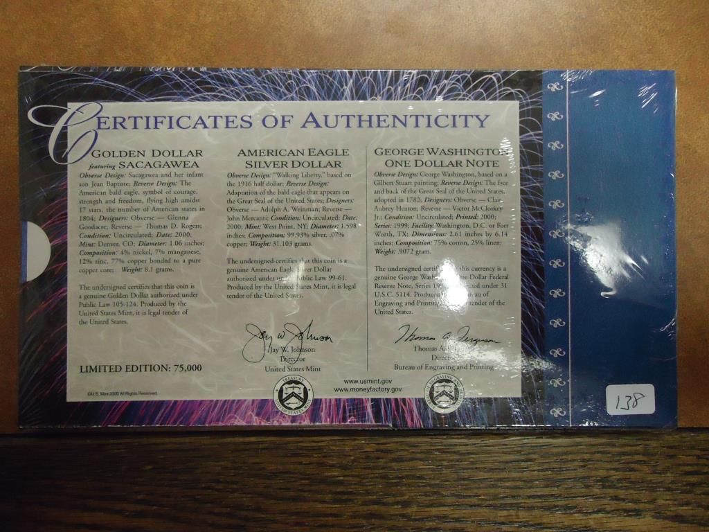 SEALED, CONTAINS: SACAGAWEA DOLLAR, AMERICAN SILVER EAGLE & $1 FRN