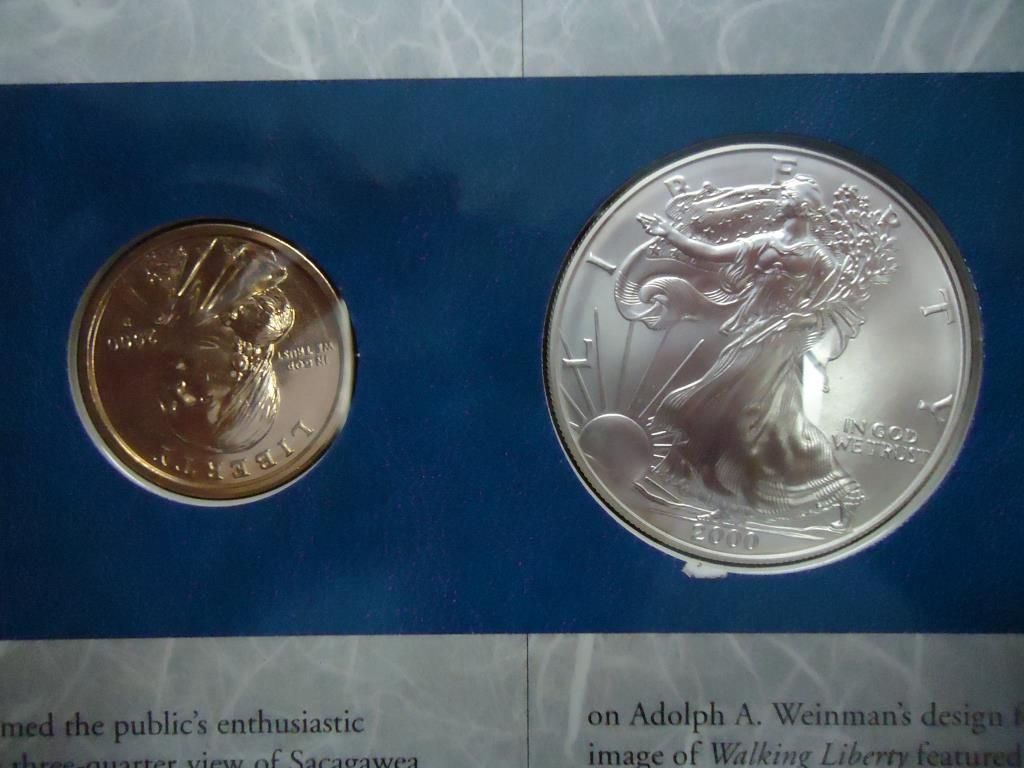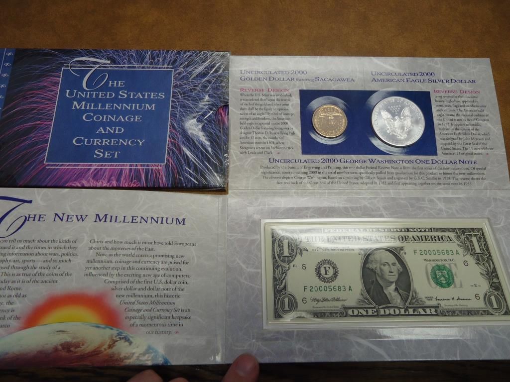 CONTAINS: 2000-D SACAGAWEA DOLLAR (UNC), 2000 AMERICAN SILVER EAGLE (UNC) AND 1999 $1 FRN CRISP UNC SERIAL NUMBER STARTS WITH 2000