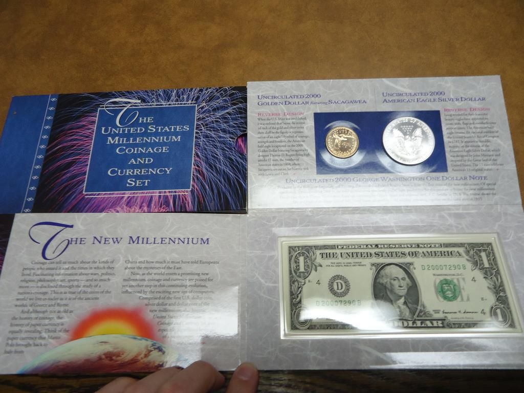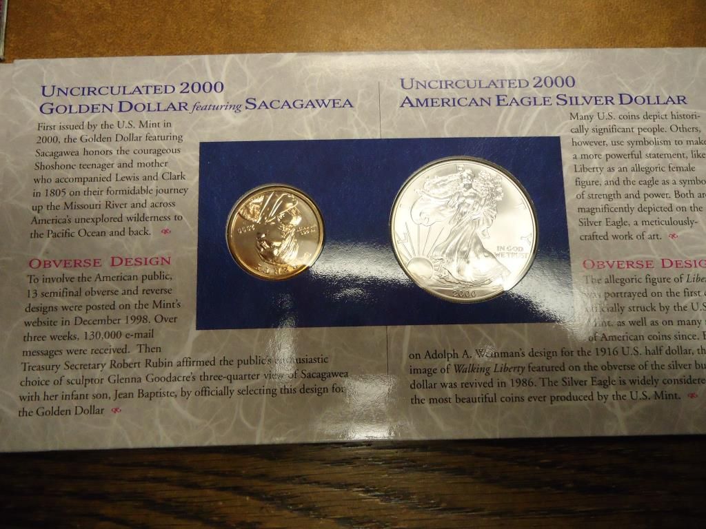 CONTAINS: SACAGAWEA DOLLAR, AMERICAN SILVER EAGLE AND $1 FRN WITH SERAIL # STARTING 2000, ORIGINAL US MINT PACKAGING