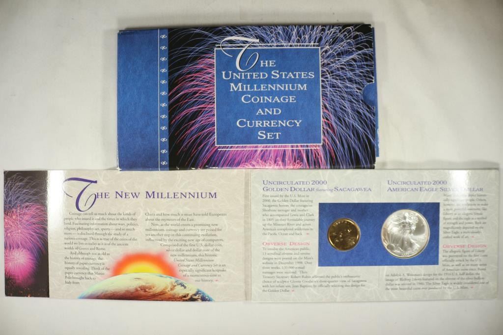 CONTAINS: UNC 2000 AMERICAN SILVER EAGLE, UNC 2000 SACAGAWEA DOLLAR AND 1999 $1 FRN WITH SERIAL NUMBER STARTING WITH 2000, ORIGINAL US MINT PACKAGING, 2021 REDBOOK RETAIL IS $100.00
