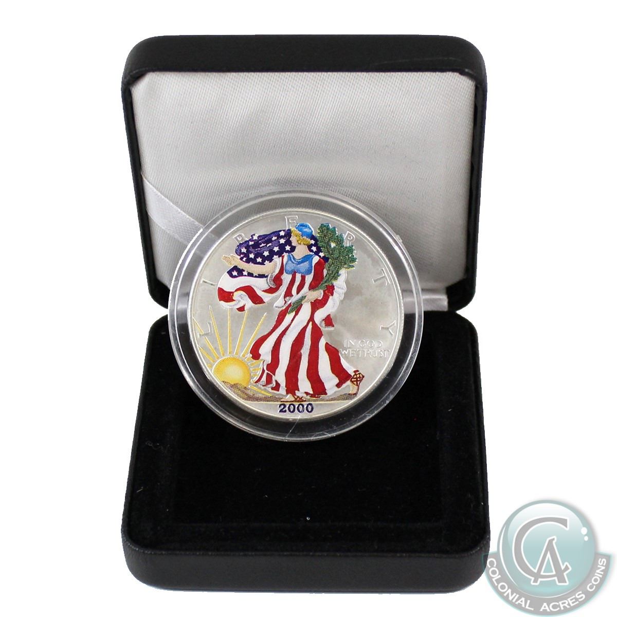 2000 USA 1oz .999 Fine Silver Colourized Eagle Encapsulated in Black Display Box (Coin is toned & Capsule is scratched). TAX Exempt