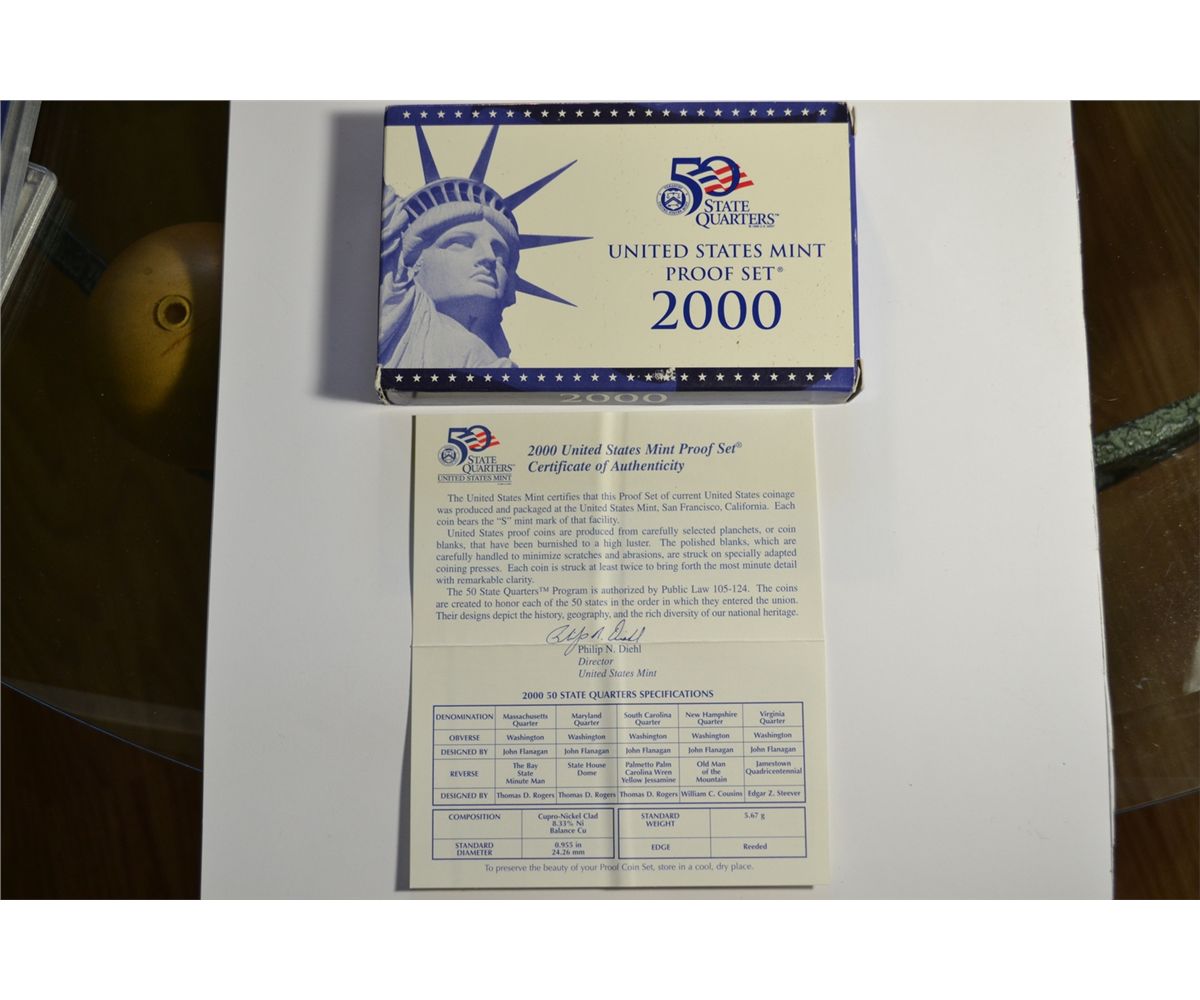 *2000 United States Mint Proof Set with Certificate of Authenticity Excellent Condition Includes all 2000 State Quarters* ***Coin, Currency & All Items Listed in this auction - Grades, Conditions and Values are not Safe Deposit Coins LLC Responsibilty. Grades, Condition and Values are determined by Consigner(s) & Buyers ONLY***