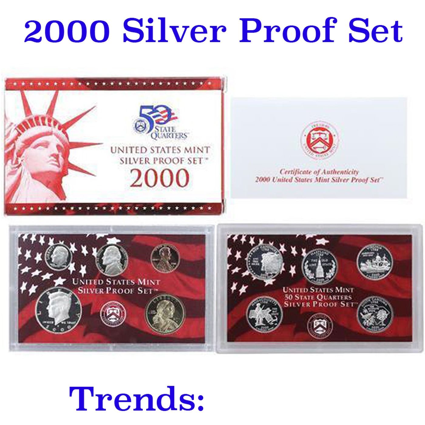 2000 United States Silver Proof Set - 10 pc set, about 1 1/2 ounces of pure silver. The Set contains 5 90% Silver Proof State Quarters, a 90% Silver Proof Half Dollar, a 90% Silver Proof Dime, as well as 4 additional Proof coins Including the Sacagawea Proof Dollar coin. Complete with Original Packaging and COA. Note* The set contains about 1 1/2 Ounces of Pure Silver.