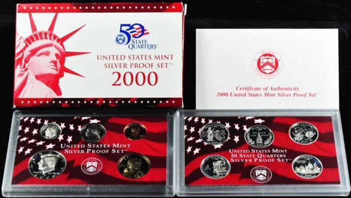 The Set contains 5 90% Silver Proof State Quarters, a 90% Silver Proof Half Dollar, a 90% Silver Proof Dime, as well as 3 additional Proof coins Including the Sacagawea Proof Dollar coin. Complete with Original Packaging and COA. Note* The set contains about 1 1/2 Ounces of Pure Silver. Estimated Value $50