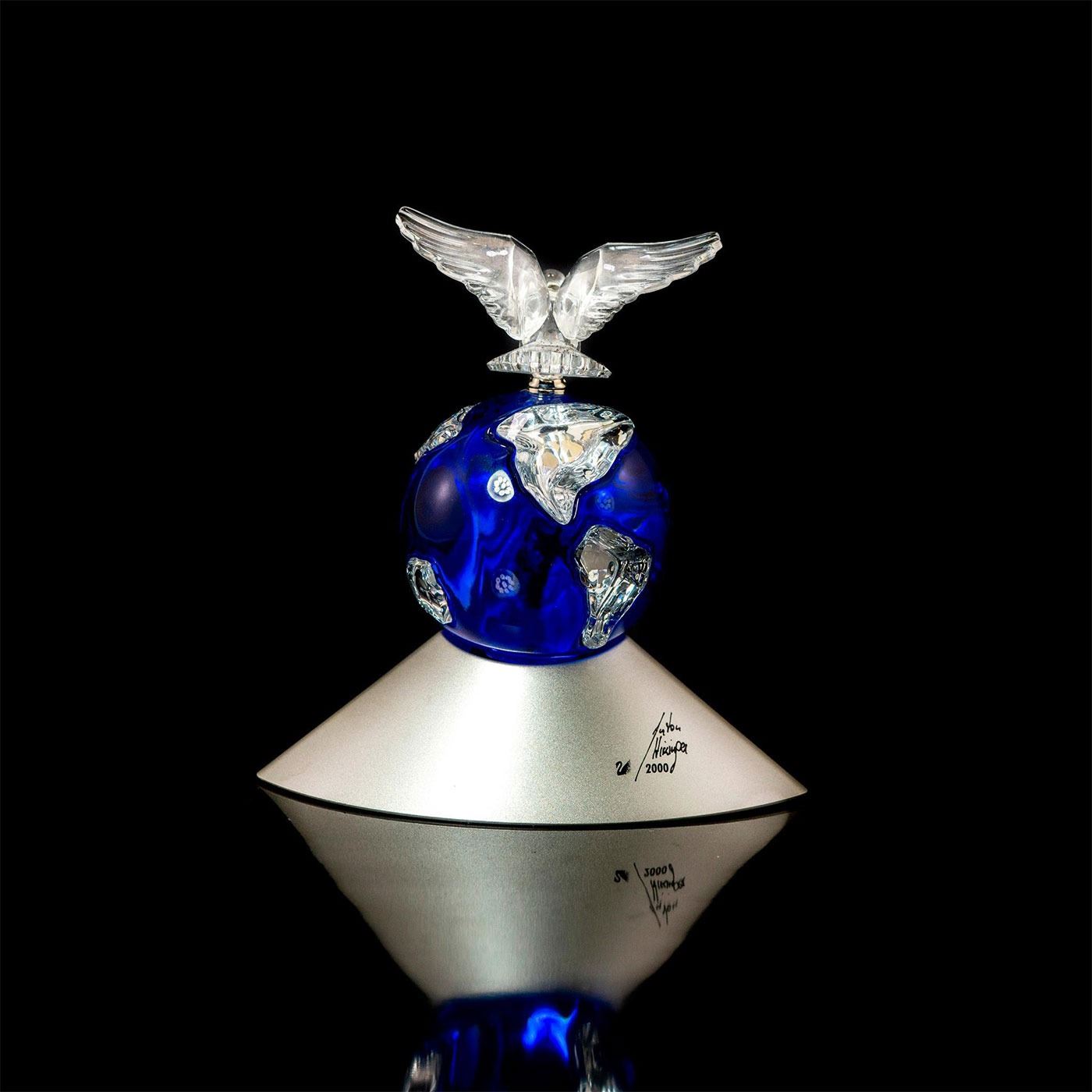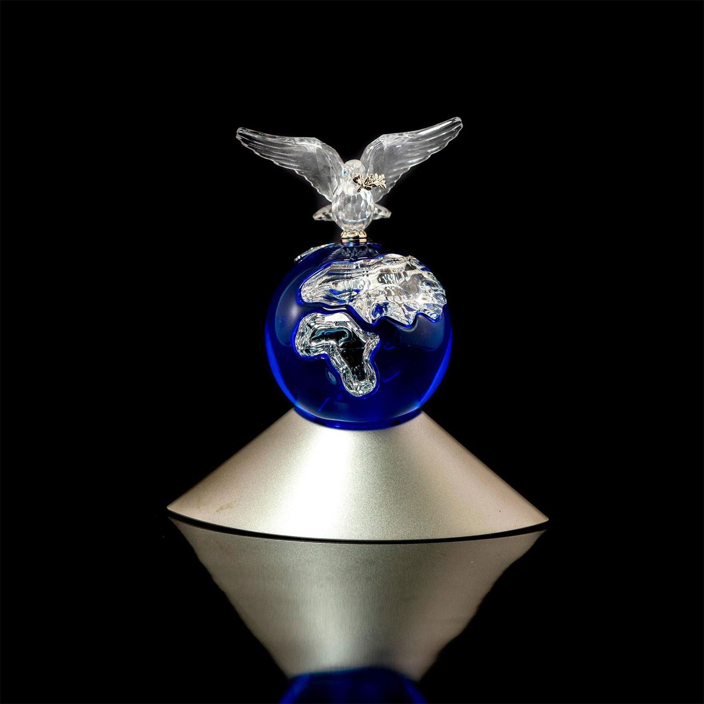 World Peace Millenium edition of a blue planet with a peace dove mounted on top with delicate metal parts. Spinning globe and dove on a designer signed base. Certificate of Authenticity.