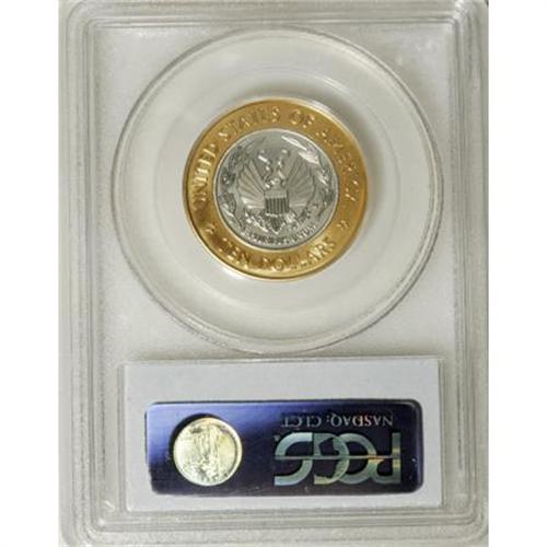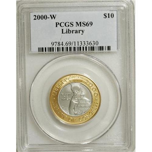<B>2000-W $10 Library of Congress Bimetallic Ten Dollars MS69 PCGS.</B></I> A virtually perfect example of the strikingly beautiful bimetallic Library of Congress gold piece. Both sides are fully brilliant with satin luster.<BR><BR><b>Shipping:</b> Coins & Currency (<a target="_blank" href="http://www.heritageauctions.com/common/shipping.php">view shipping information</a>)