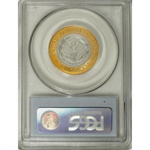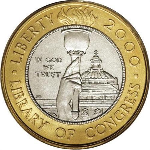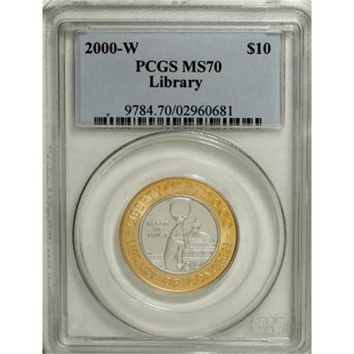 <B>2000-W $10 Library of Congress Bimetallic Ten Dollars MS70 PCGS.</B></I> The nation's first and only bimetallic commemorative issue is also the first to incorporate platinum as a coinage metal. Precisely detailed with wonderful contrast between the butter-yellow outer ring of gold and the satiny surfaces of the inner ring of platinum. This is a flawless example. One of the most elusive modern commemoratives, with just 7,261 pieces struck. Population: 88 in 70, 0 finer (8/07).<BR><BR><b>Shipping:</b> Coins & Currency (<a target="_blank" href="http://www.heritageauctions.com/common/shipping.php">view shipping information</a>)
