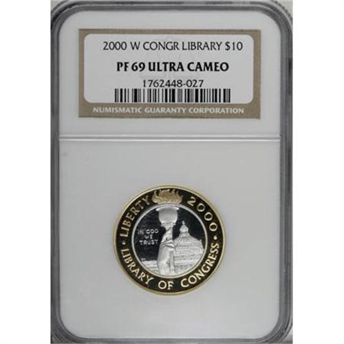<B>2000-W $10 Library of Congress PR69 Deep Cameo NGC.</B></I> NGC Census: (0/0). PCGS Population (1175/19). Numismedia Wsl. Price for NGC/PCGS coin in PR69: $1,050. (#99784)<BR><BR><b>Shipping:</b> Coins & Currency (<a target="_blank" href="http://www.heritageauctions.com/common/shipping.php">view shipping information</a>)