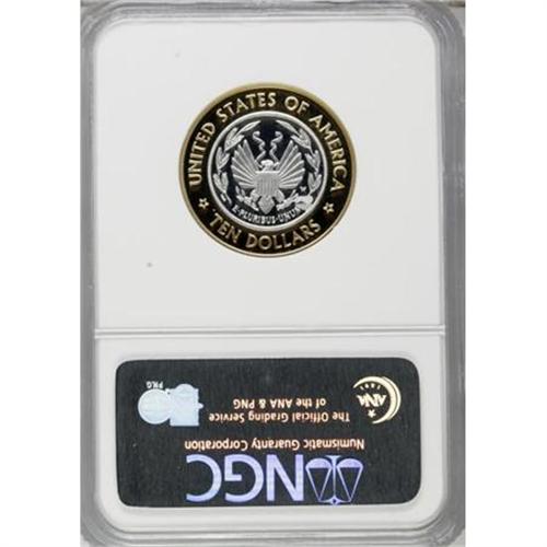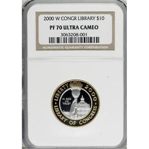 <B>2000-W $10 Library of Congress PR70 Deep Cameo NGC.</B></I> A gleaming, flawless, and deeply reflective specimen of this distinctive commemorative, the nation's only bimetallic commemorative to date. Both the outer ring of gold and the inner ring of platinum show stellar contrast.<BR><BR><b>Shipping:</b> Coins & Currency (<a target="_blank" href="http://www.heritageauctions.com/common/shipping.php">view shipping information</a>)