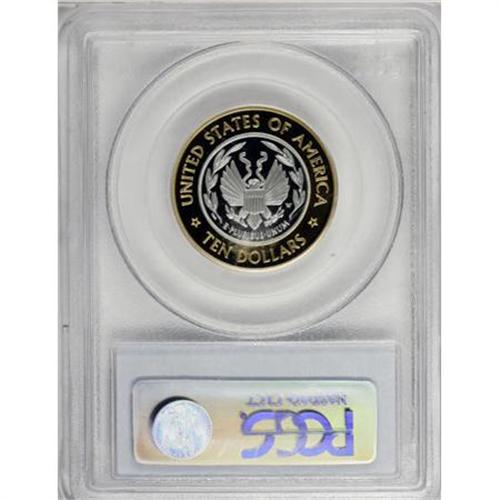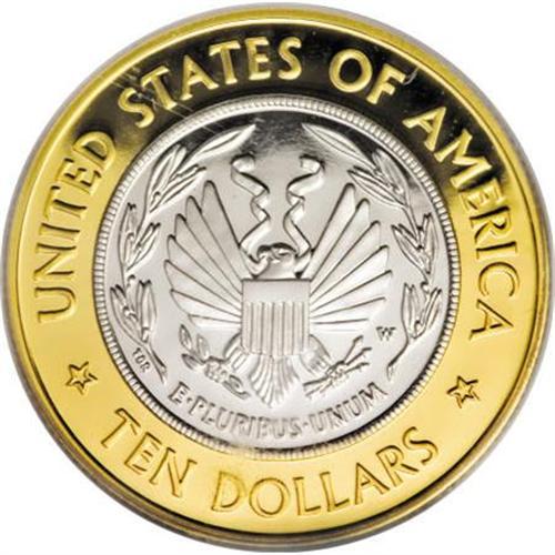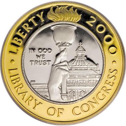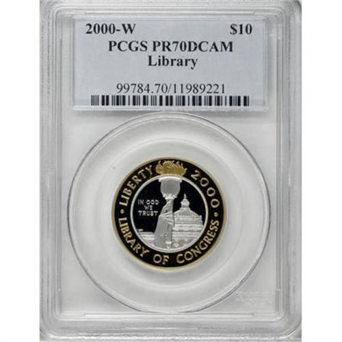 <B>2000-W $10 Library of Congress PR70 Deep Cameo PCGS.</B></I> This is a splendid example of America's only bimetallic coinage issue. The outer ring is gold, the inner ring platinum. The design elements are crisply and flawlessly produced on each side, and the deeply prooflike surfaces are immaculately preserved. Listed on page 310 of the 2008 <I>Guide Book</B></I>. Population: 26 in 70 (1/08).<BR><BR><b>Shipping:</b> Coins & Currency (<a target="_blank" href="http://www.heritageauctions.com/common/shipping.php">view shipping information</a>)