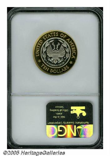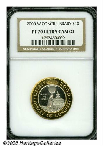 <B>2000-W<$10> Library of Congress PR70 Ultra Cameo NGC.</B></I> Perfect in every category. The only bimetallic issue within the modern commemorative series, also unusual for its $10 denomination and its platinum alloy.