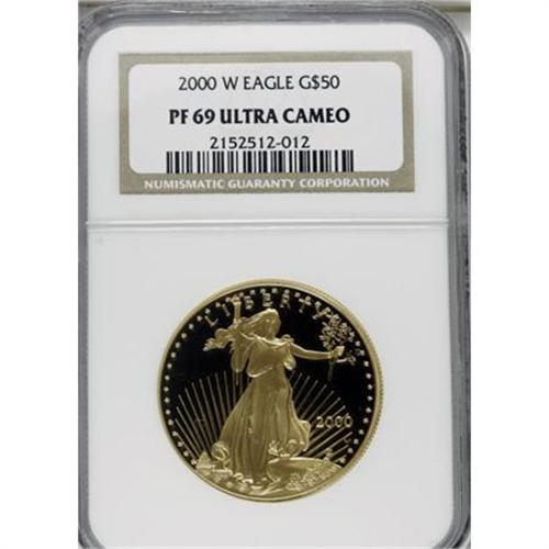 <B>2000-W G$50 One-Ounce Gold Eagle PR69 Deep Cameo NGC.</B></I> NGC Census: (369/234). PCGS Population (705/20). Numismedia Wsl. Price for NGC/PCGS coin in PR69: $700. (#99953)<BR><BR><b>Shipping:</b> Coins & Currency (<a target="_blank" href="http://www.heritageauctions.com/common/shipping.php">view shipping information</a>)