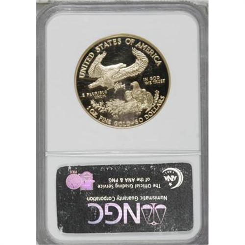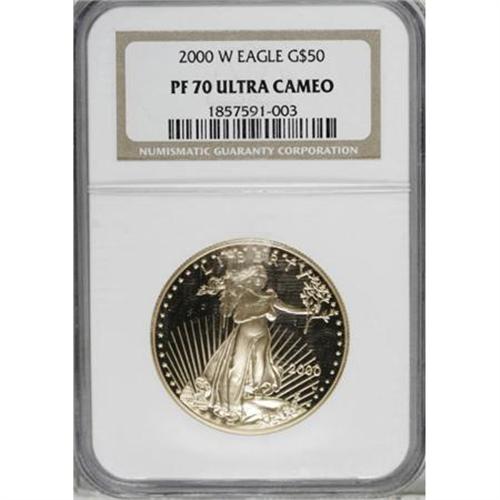 <B>2000-W G$50 One-Ounce Gold Eagle PR70 Deep Cameo NGC.</B></I> . NGC Census: (309/0). PCGS Population (32/0). Numismedia Wsl. Price for NGC/PCGS coin in PR70: $1,600. (#99953)<BR><BR><b>Shipping:</b> Coins & Currency (<a target="_blank" href="http://www.heritageauctions.com/common/shipping.php">view shipping information</a>)