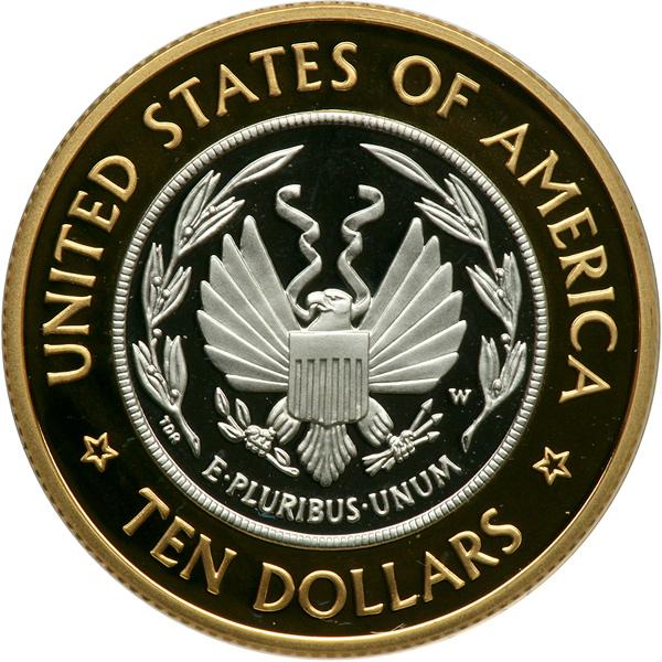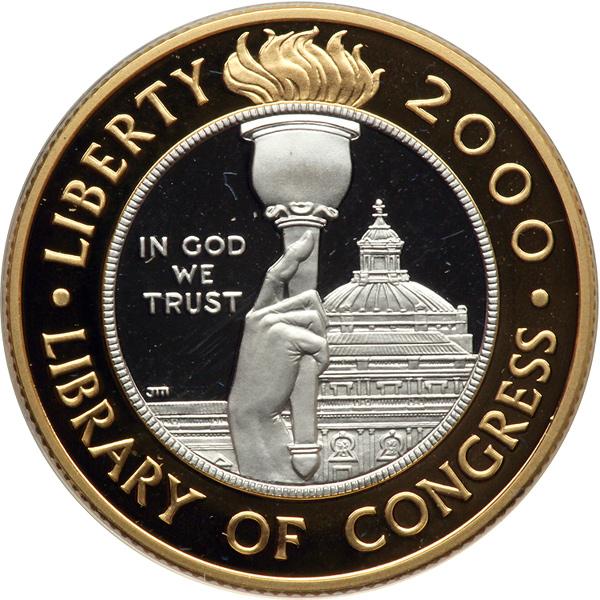 2000-W Library of Congress $10 Bimetallic Proof Coin. Housed in the original box of issue. Composition: 48% Platinum and 48% Gold. Gem Proof.