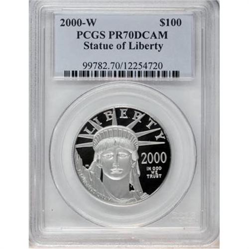<B>2000-W P$100 One-Ounce Platinum Eagle PR70 Deep Cameo PCGS.</B></I> A gleaming and technically perfect exemplar from the "America's Heartland" reverse issue, impeccably contrasted and magnificent in every respect. PCGS has graded just 27 representatives as PR70 Deep Cameo (1/08).<BR><BR><b>Shipping:</b> Coins & Currency (<a target="_blank" href="http://www.heritageauctions.com/common/shipping.php">view shipping information</a>)