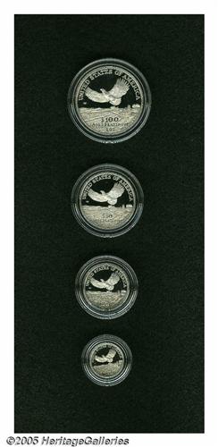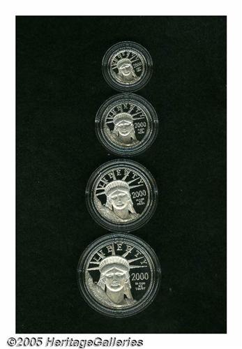 <B>2000-W<P$100> Platinum Eagle Set PR69 Deep Cameo Uncertified.</B></I> The set includes: <B>$10 Tenth-Ounce; $25 Quarter-Ounce; $50 Half-Ounce;</B></I> and the <B>$100 One-Ounce.</B></I> All pieces demonstrate unimprovable white on black contrast. The sole year of the "Eagle Above America's Heartland" design. The presentation box and certificate of authenticity accompany.