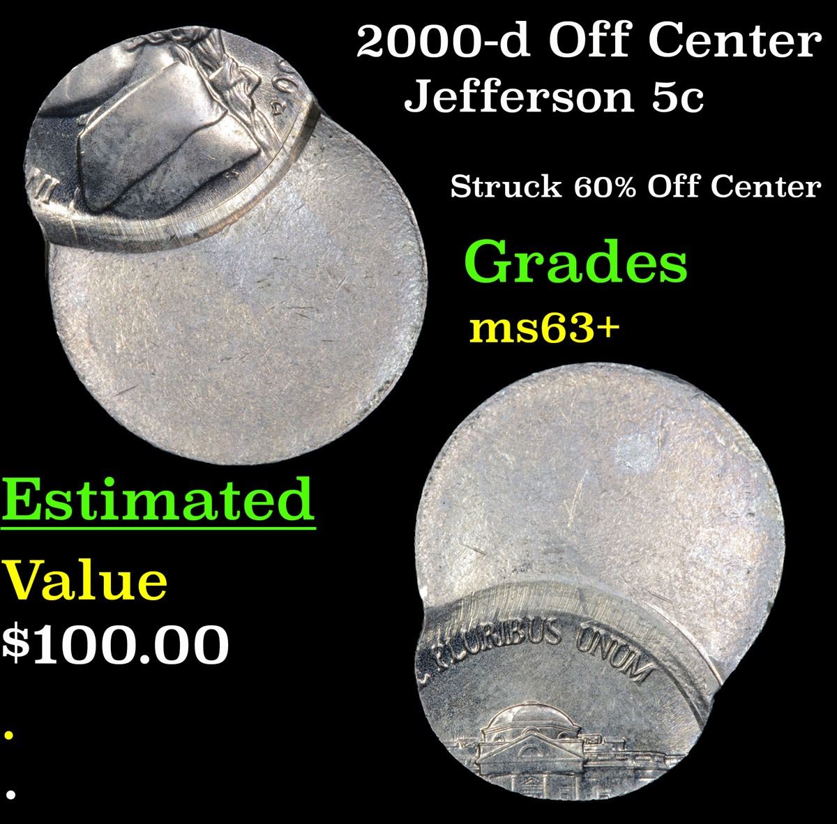 2000-d Off Center Jefferson Nickel 5c Grades Select+ Unc.
