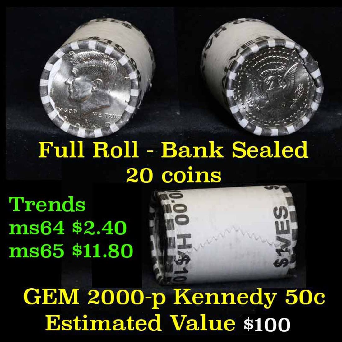 2000-p $10 Bank Rolled Kennedy Half Dollar Shotgun Roll. An original bank shotgun roll. A great roll. ms65 trends $17/coin, $340
