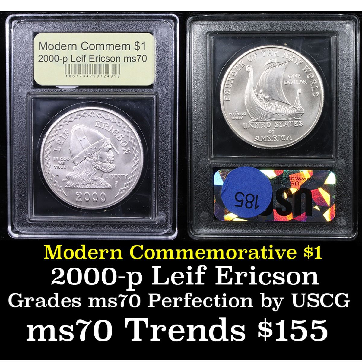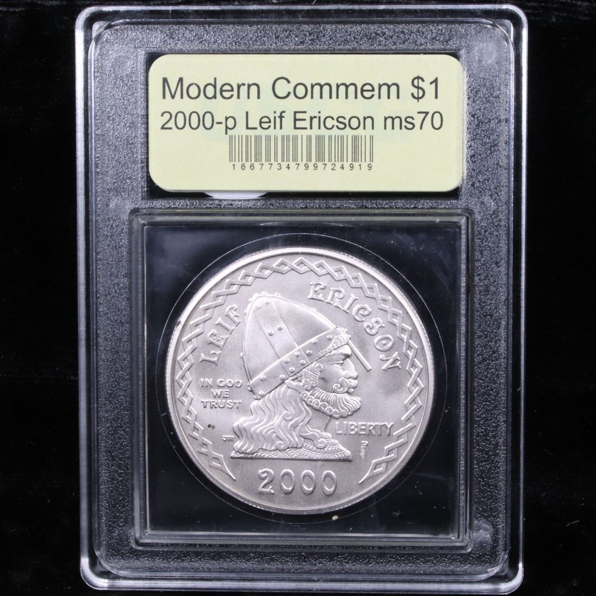 2000-p Leif Ericson Modern Commem Dollar $1 Graded ms70, Perfection By USCG. The 2000 Leif Ericson Silver Dollar was issued by the United States Mint in cooperation with the Republic of Iceland to mark the 1,000th anniversary of his discovery of the New World. This Perfect coin is graded PR70 Deep cameo by USCG.