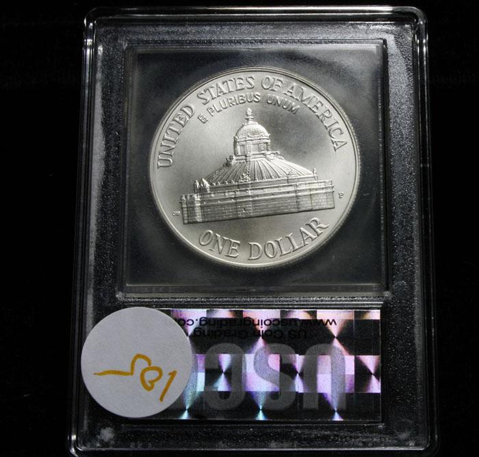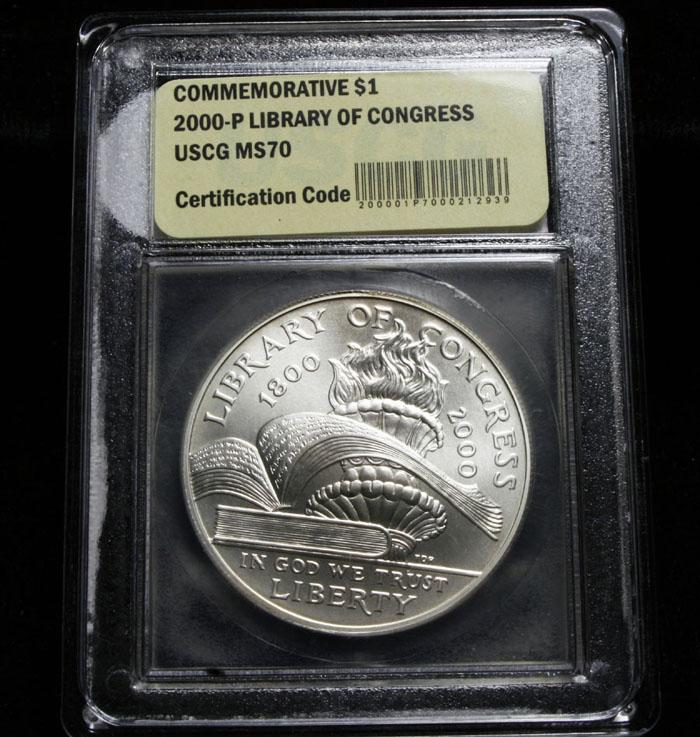 A coin celebrating the 200th Anniversary of the Library of Congress. PCGS lists ms70 at $525. This example is A perfect Commemorative Graded ms70 by USCG. Estimated Value $200