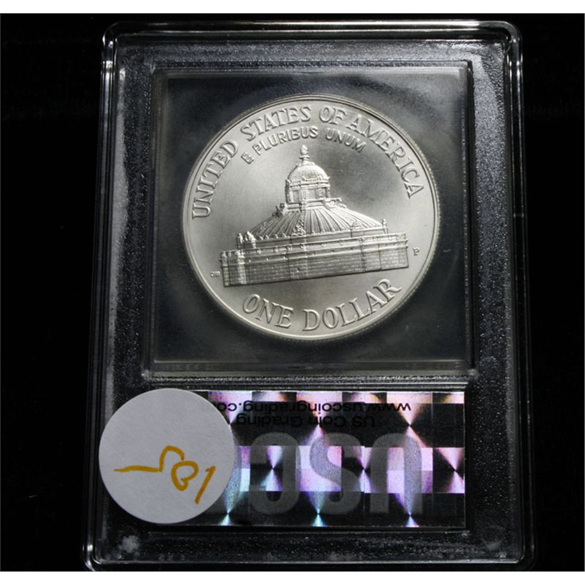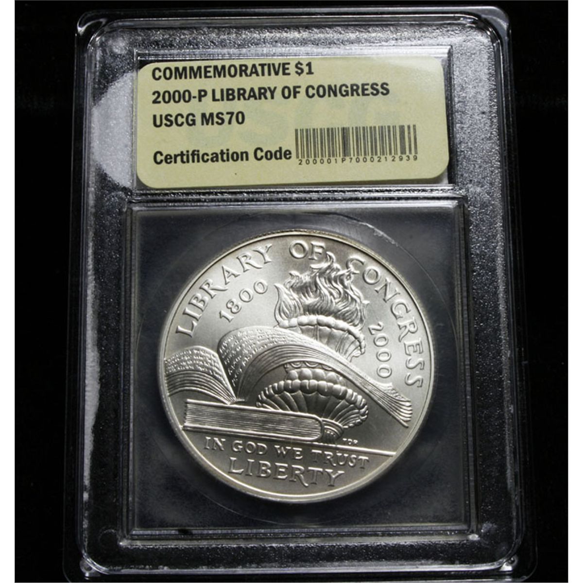 A coin celebrating the 200th Anniversary of the Library of Congress. PCGS lists ms70 at $525. This example is A perfect Commemorative Graded ms70 by USCG. Estimated Value $200