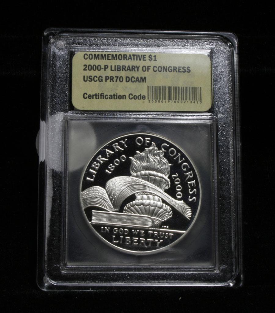 Issued to celebrate the 200th anniversary of the founding of the Library of Congress. The coin is encapsulated and graded PR70 DCAM by USCG. PCGS list PR70 as $1325. Estimated Value $350.