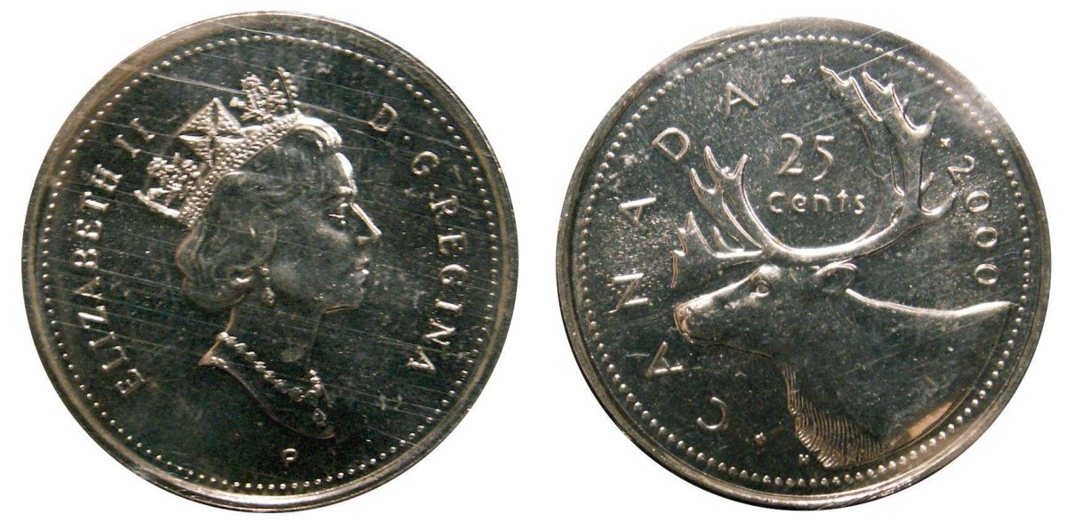 2000P CARIBOU 25¢ ICCS MS64. Exrtremely RARE 2000P Caribou example. Only 2 known. 2000P Community and Creativity have been sold to Private collectors for between $12000 to $15000 each in similar grades. However there are 4 to 5 examples of each known to be on the open market to present. The Caribou is by far the scarcest and most sought after piece in this RARE trio. Missing in the most serious collections. Expect strong bidding. The finest known!