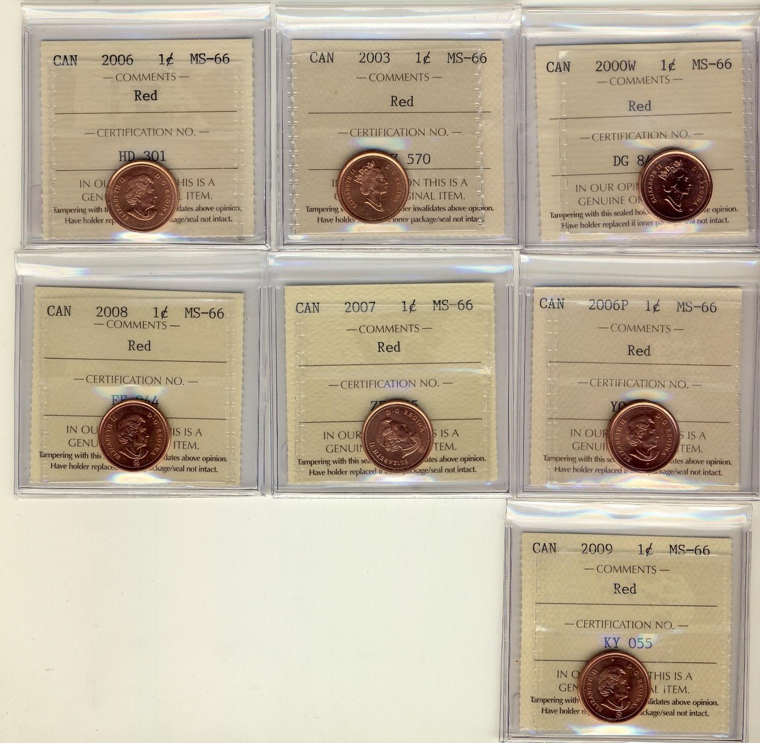 2000W, 2003, 2006, 2006P, 2007, 2008, 2009, 1¢ ICCS MS66 Red, Lot of 7 coins,