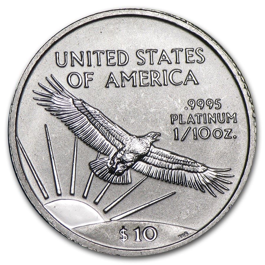 Product ID: 4886 Year: 2001 Grade: Brilliant Uncirculated Grade Service: None Denomination: $10 Mint Mark: None Metal Content: 0.1 troy oz Purity: .9995 Manufacturer: U.S. Mint Thickness: 0.94 mm Diameter: 16.5 mm