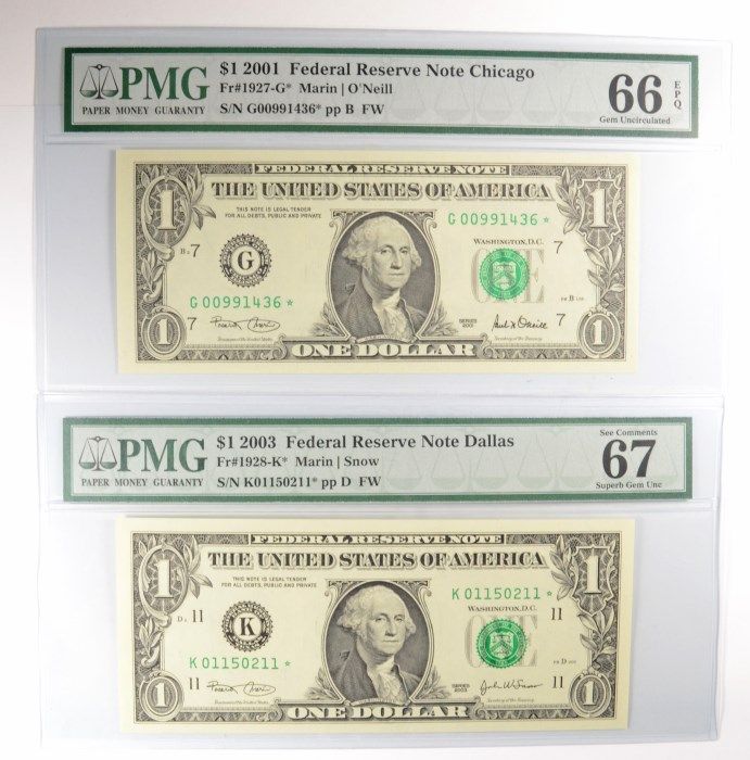 2001 $1 FEDERAL RESERVE NOTE (STAR) CHICAGO, IL PMG 66 EPQ & 2003 $1 FEDERAL