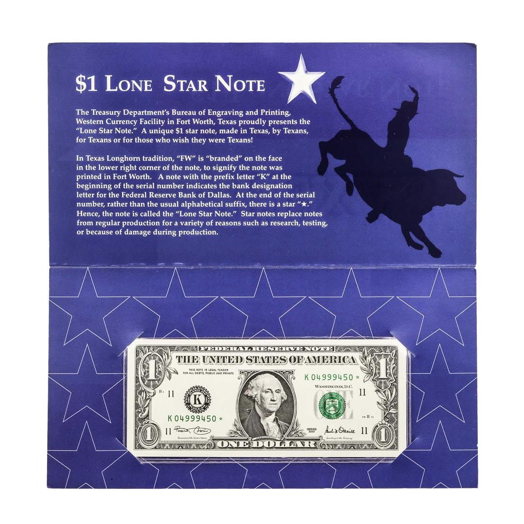 One 2001 $1 Federal Reserve Lone Star Note.