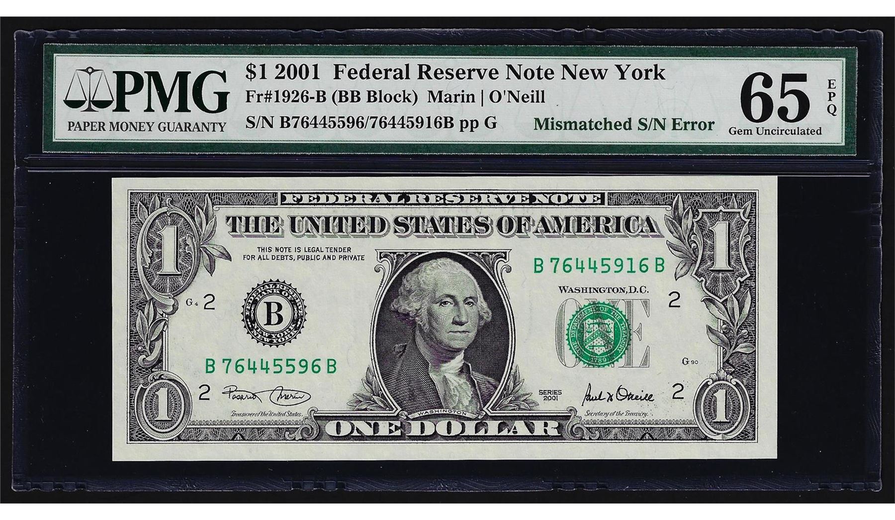One 2001 $1 Federal Reserve Note Mismatched Serial Number ERROR PMG Gem Unc. 65EPQ. PMG Certified.