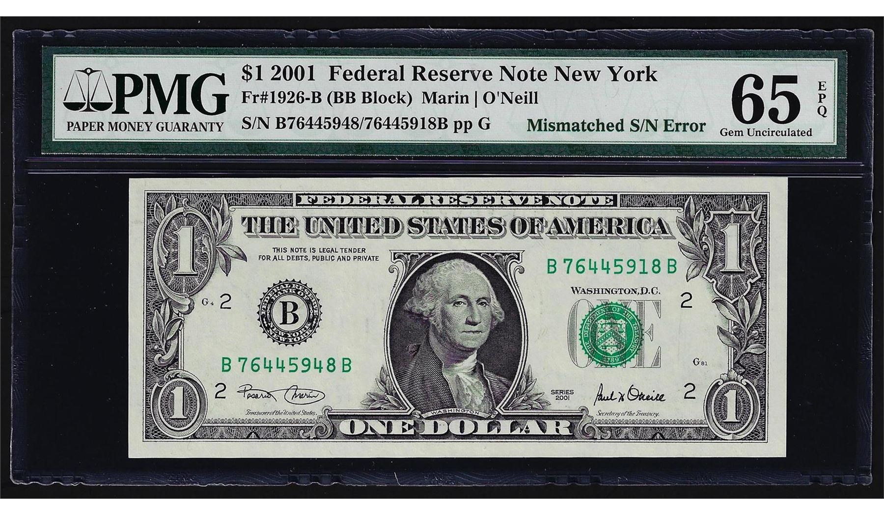 One 2001 $1 Federal Reserve Note Mismatched Serial Number ERROR PMG Gem Unc. 65EPQ. PMG Certified.