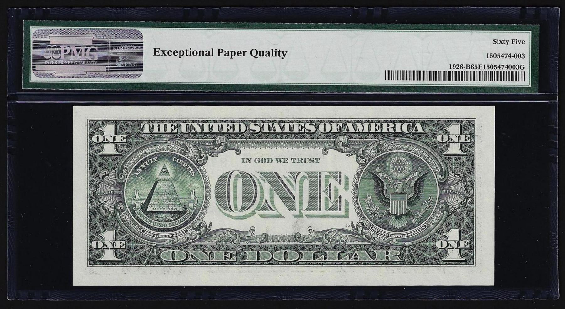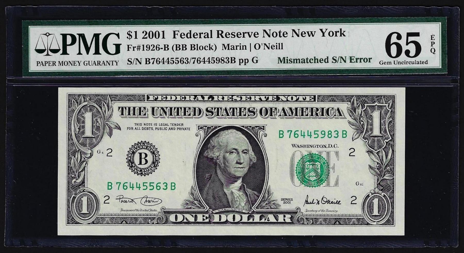 One 2001 $1 Federal Reserve Note Mismatched Serial Number ERROR PMG Gem Unc. 65EPQ. PMG Appraised.
