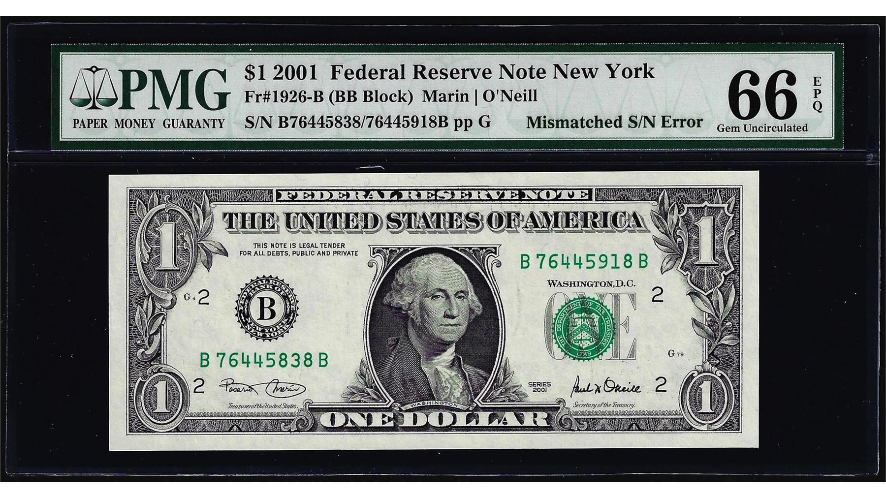 One 2001 $1 Federal Reserve Note Mismatched Serial Number ERROR PMG Gem Uncirculated 66EPQ. PMG Certified.