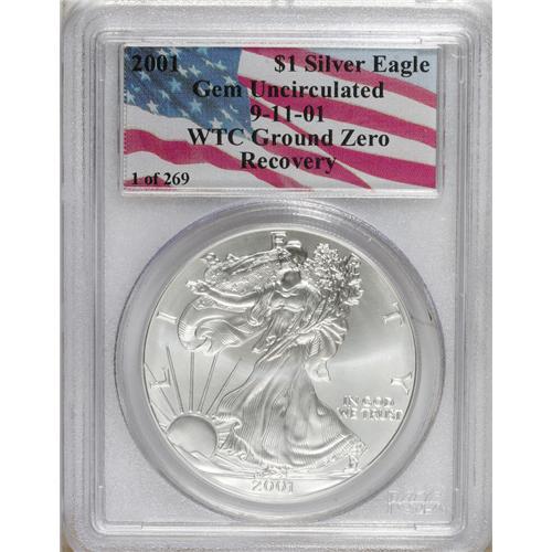 <B>2001 $1 Silver Eagle Gem Uncirculated PCGS.</B></I> 9-11-01 WTC Ground Zero Recovery. (#9954)<BR><BR><b>Shipping:</b> Coins & Currency (<a target="_blank" href="http://www.heritageauctions.com/common/shipping.php">view shipping information</a>)